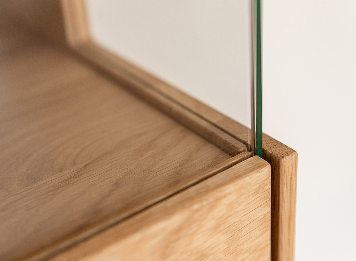 Nábytek je dodáván ve smontovaném stavu a zásuvky i dvířka jsou vybaveny systémem tlumení pro měkké a tiché zavírání. Police v prosklených částech jsou skleněné.