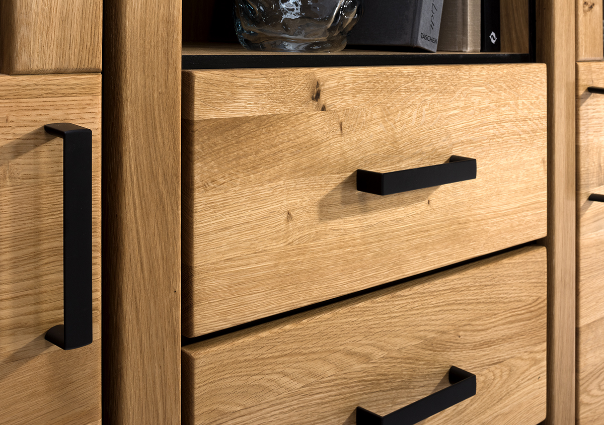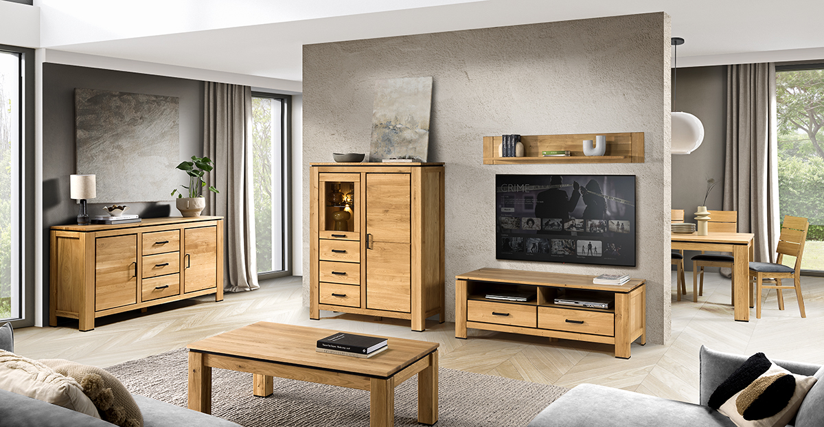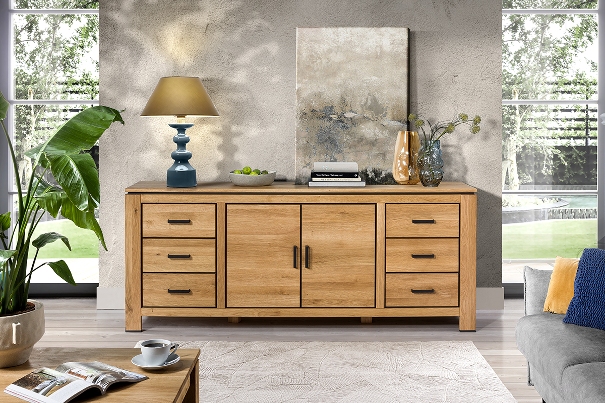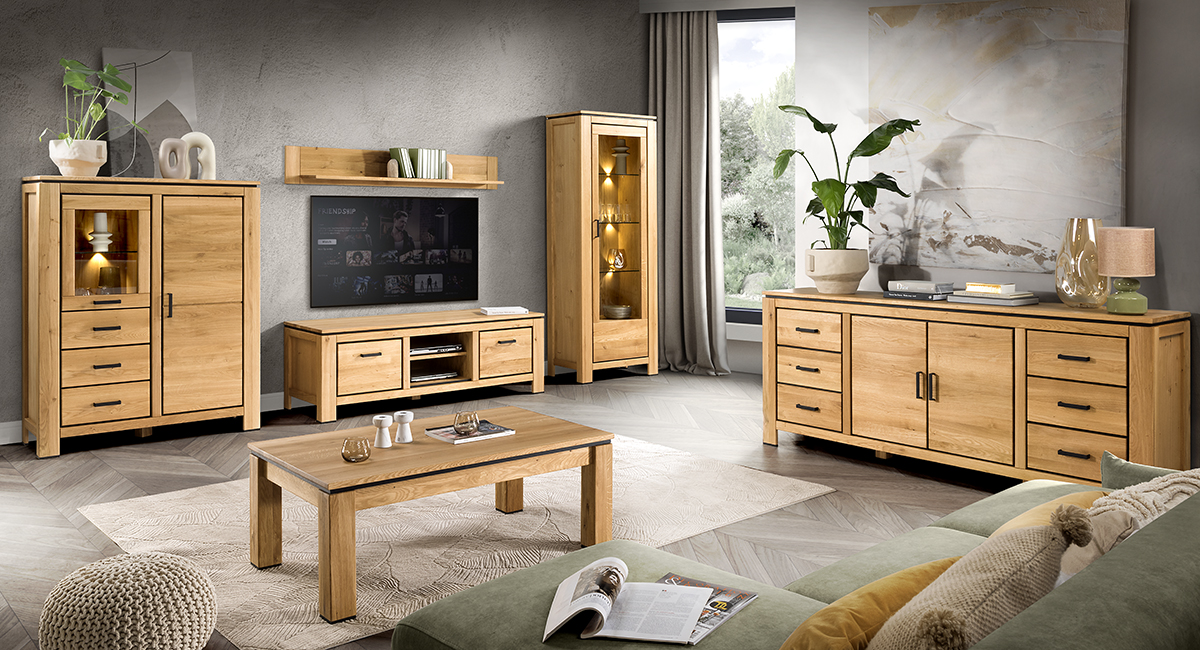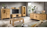 Elegantní dubová obývací sestava z masivu a přírodní dýhy. Moderní design zdůrazněný barvami sukatého dubu přinese do vašeho domova pozitivní energii klasický vzhled s moderním nádechem a elegantním bočním kazetovým vzorem, který se opakuje také u dalších prvků kolekce. Designéři, kteří se podíleli na návrzích celé kolekce Faro 2, se nechali inspirovat prostředím švýcarských Alp. Kolekce Faro 2 nabízí celou řadu samostatně prodejných prvků, díky kterým můžete zařizovat nejen obývací pokoj, ale také jídelnu. Seznamte se s celou nabídkou a vytvořte si vlastní sestavu nábytku Faro 2. Všimněte si také nápaditých nožiček které, ale na nábytku být nemusí být.