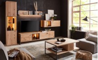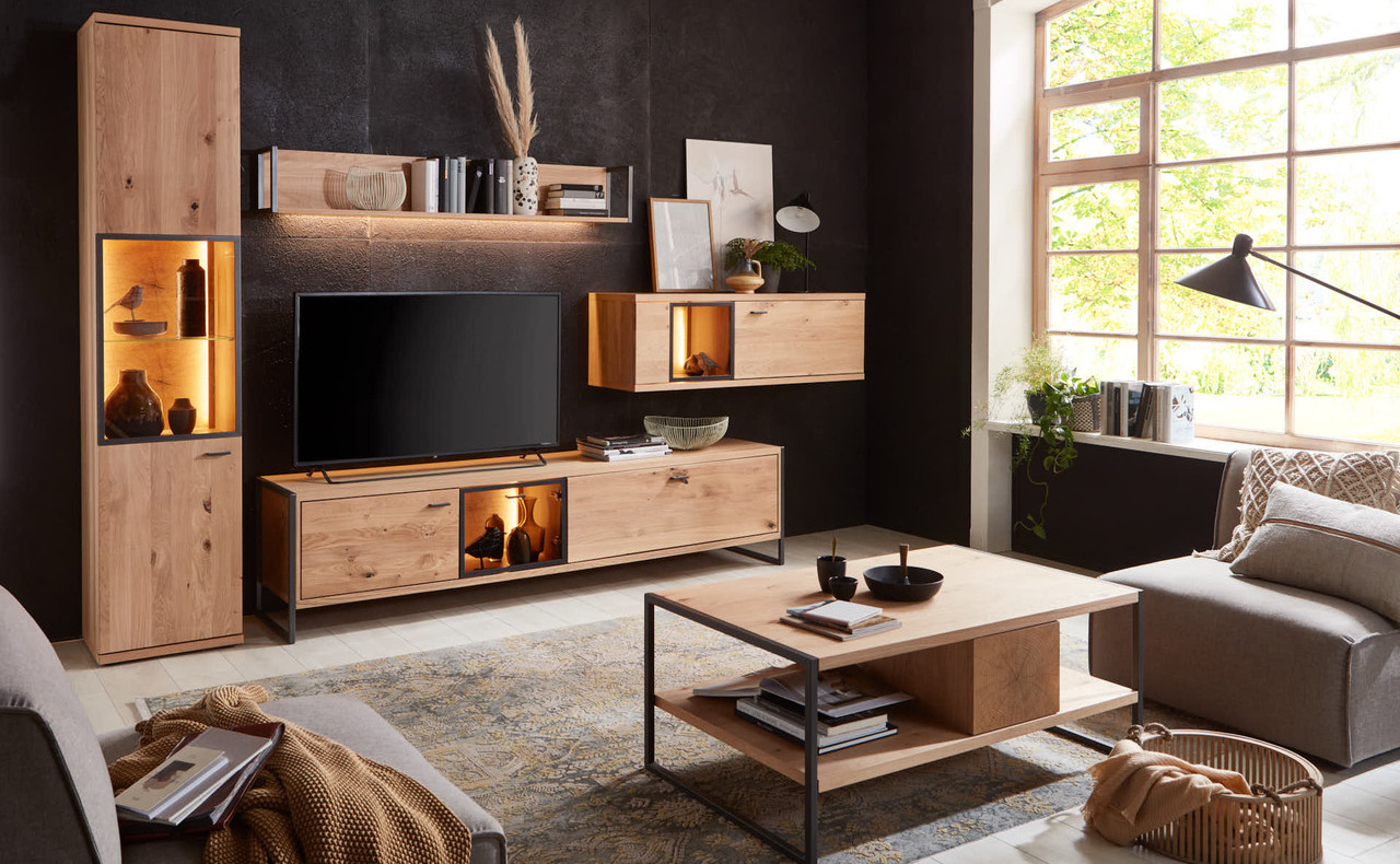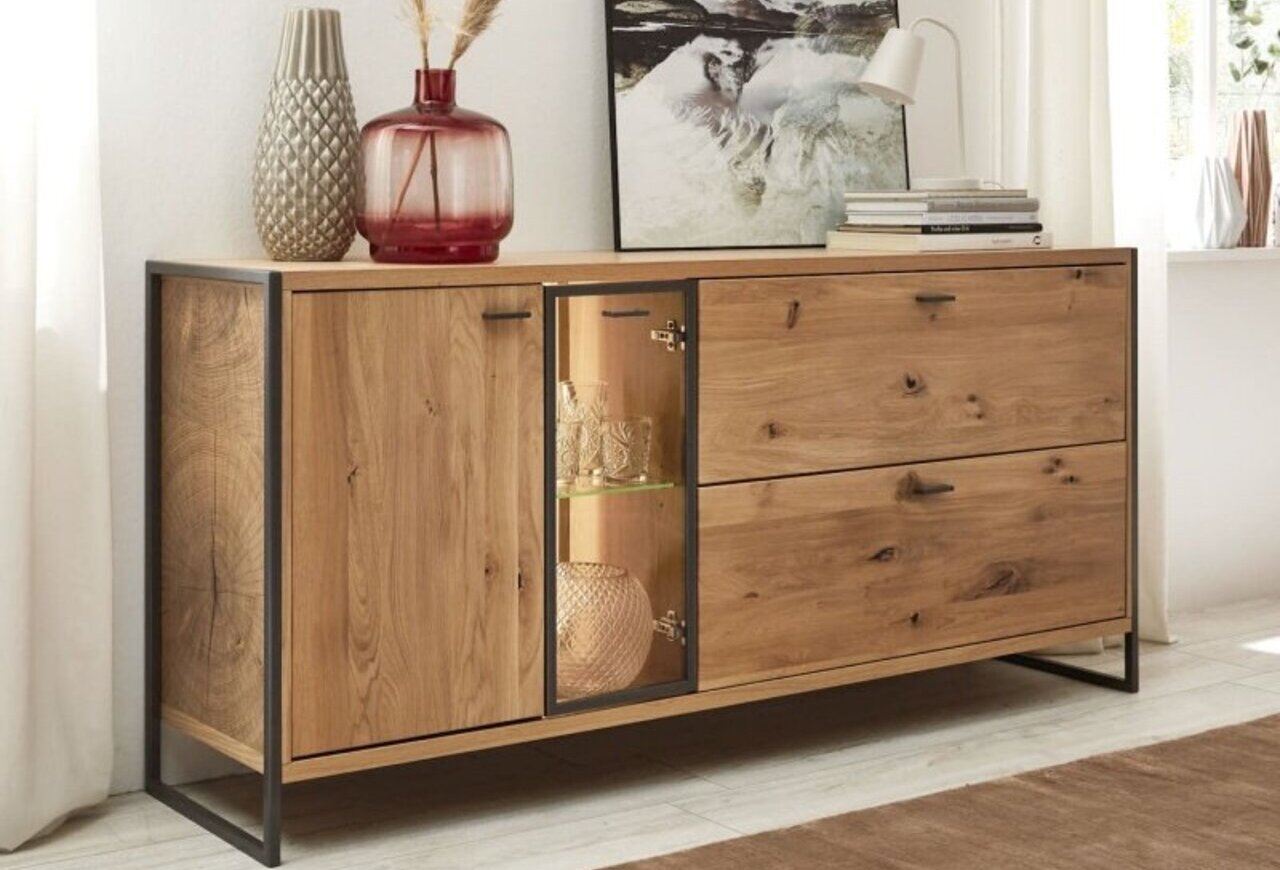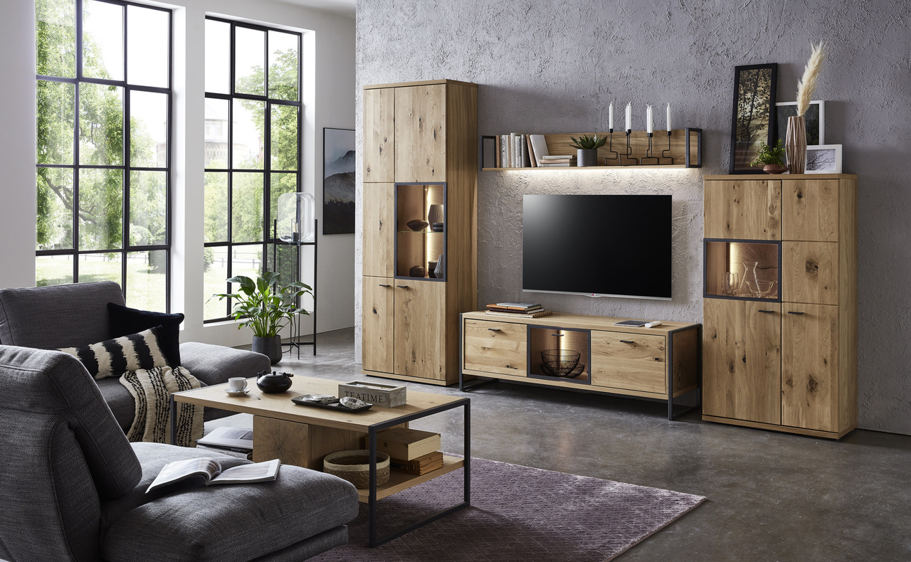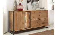 Kombinace běleného dubového masivu s železnými konstrukcemi a použitím dřeva s většími suky dáva této kolekci vysoce moderní vzhled. S tímto nábytkem určitě efektivně a vkusně zařídíte obývací pokoj nebo jídelnu vašeho bytu.
