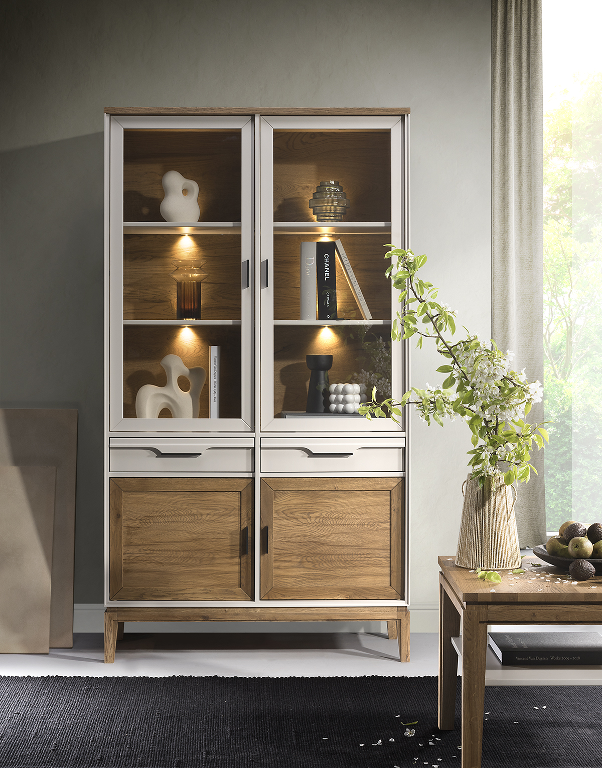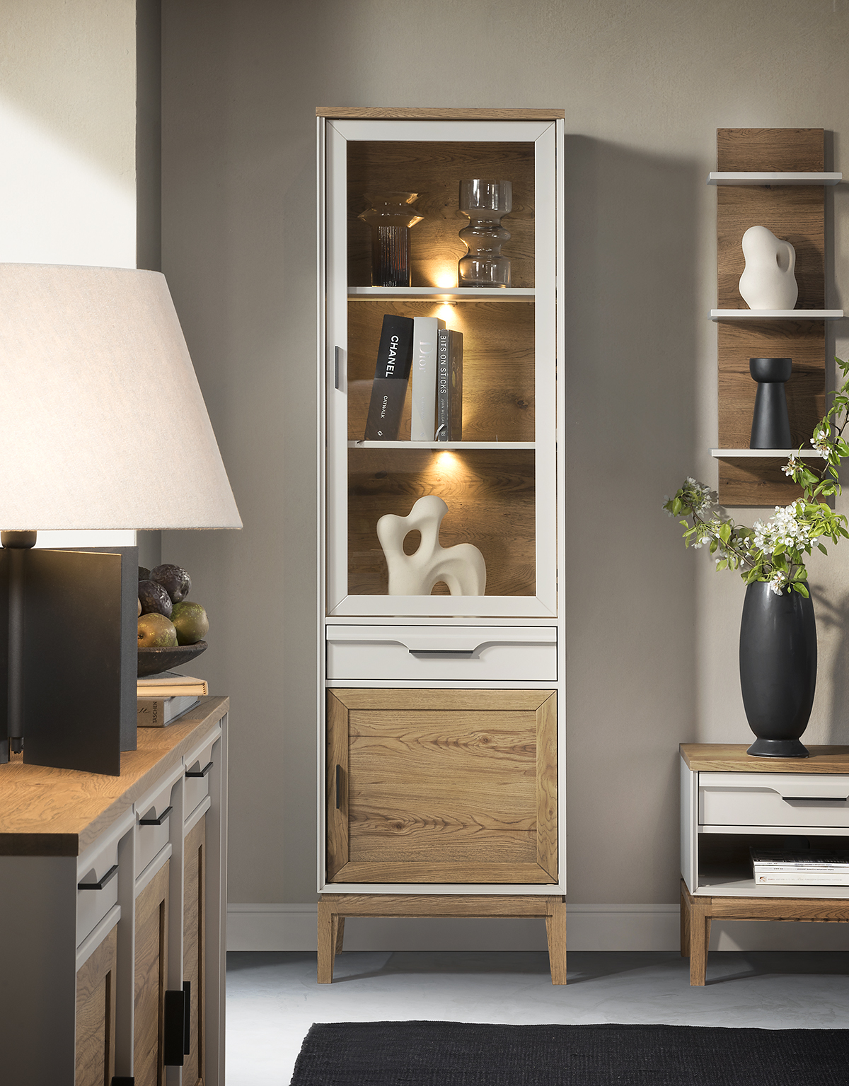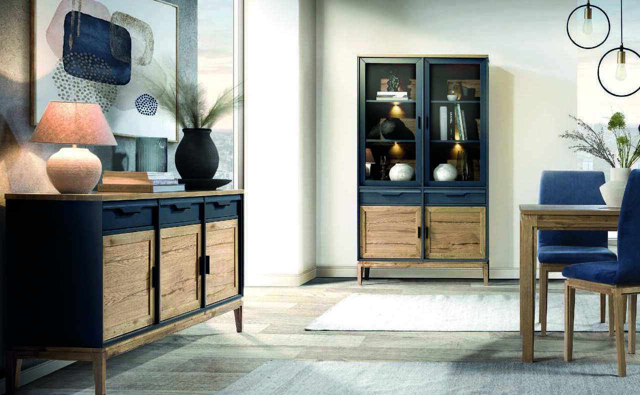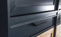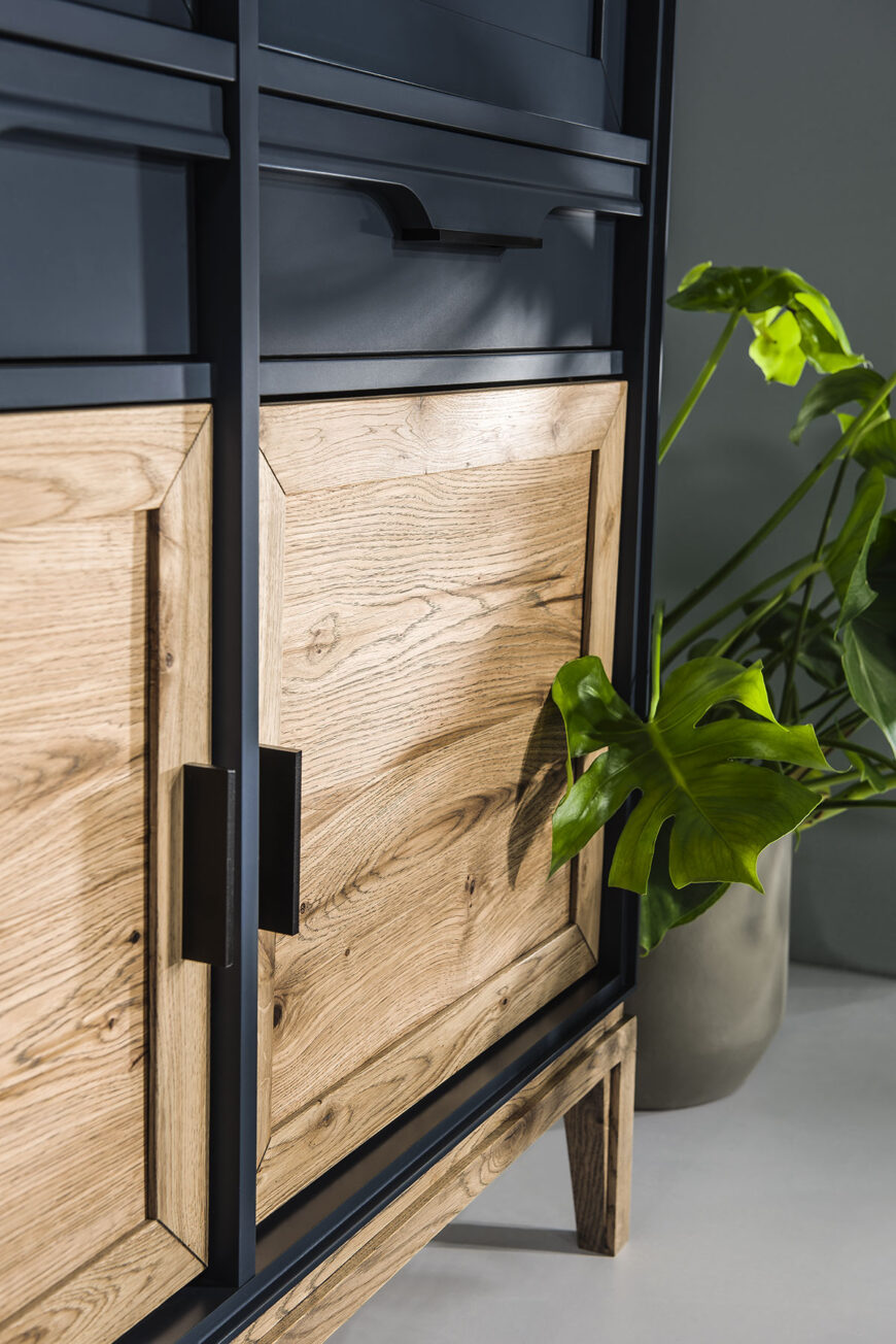 Inovativní kombinace masívního dubového dřeva a lakovanými antracitovými částmi použitá u této kolekce dává nábytku jedinečný a vysoce moderní vzhled. Dále jsou použity kvalitní rámy na prosklení a kovové úchytky. S tímto nábytkem určitě efektivně a vkusně zařídíte obývací pokoj nebo jídelnu vašeho bytu.