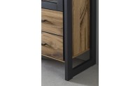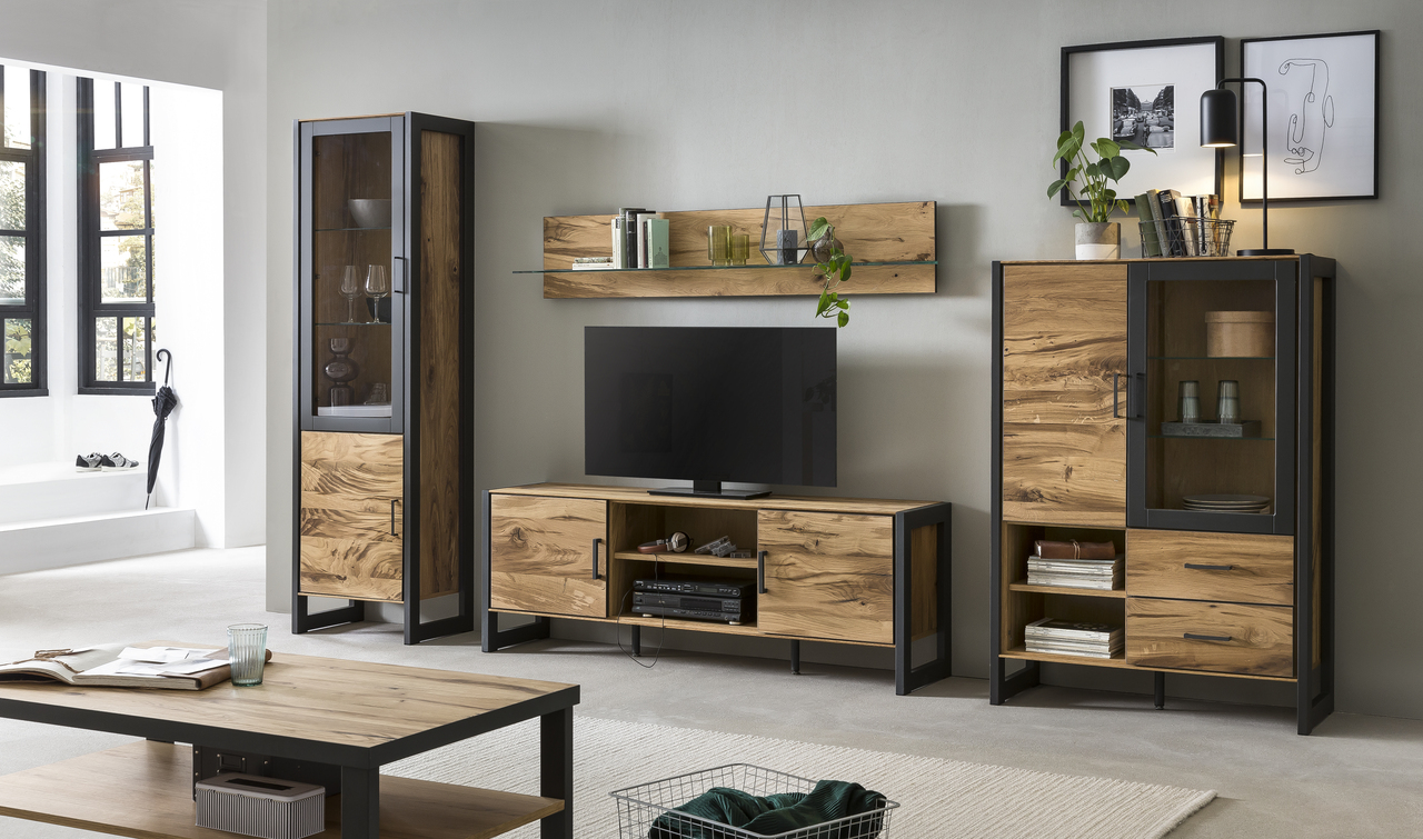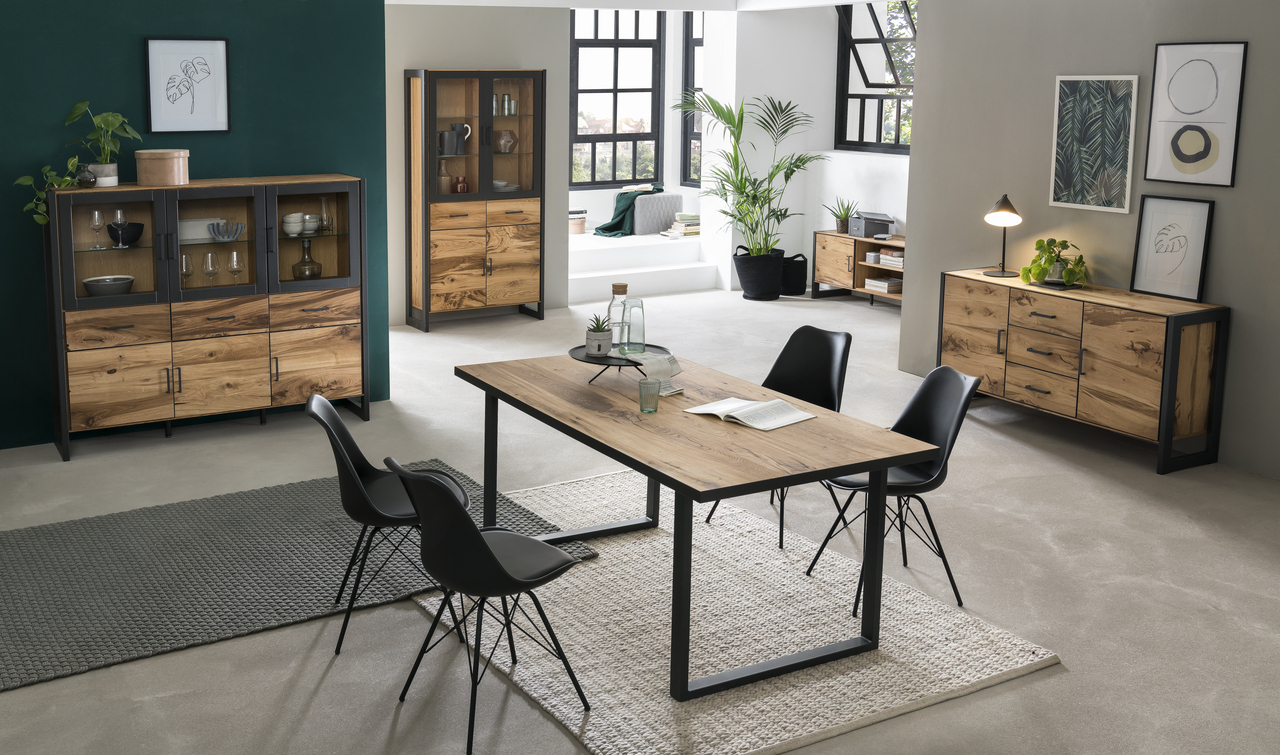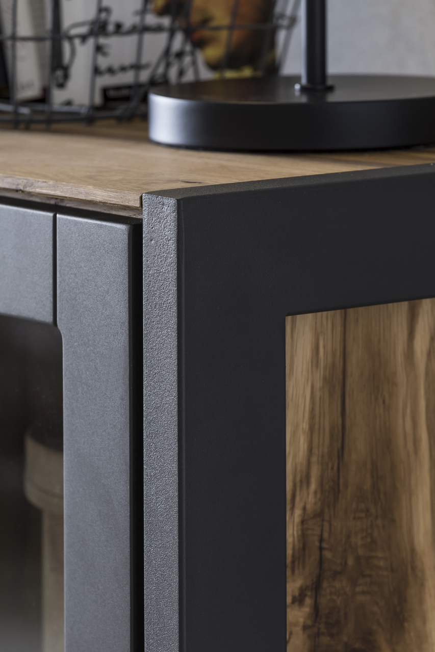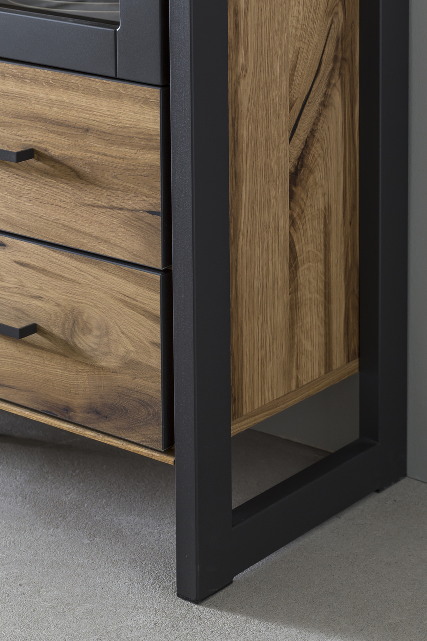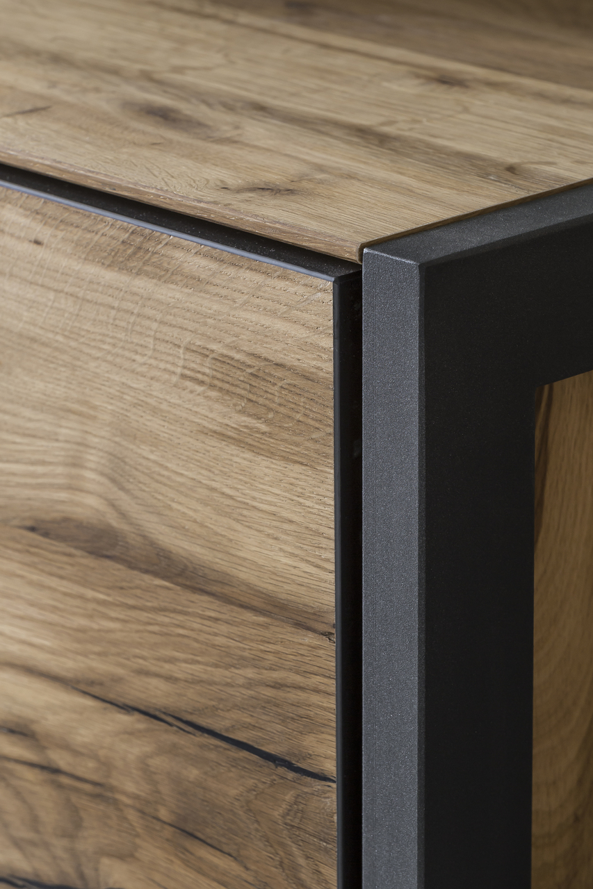 Základem této kolekce jsou kovové boky v grafitovém provedení které tvoří i nohy nábytku a dodávají mu industriální vzhled. Vysoké kovové grafitové nohy mají také svůj praktický význam protože umožňují udržovat větší čistotu v místnosti. Použitá dýha dubu divokého je k nerozeznání od masívu a umožňuje i dosažení příznivějších cen o proti masivu.
