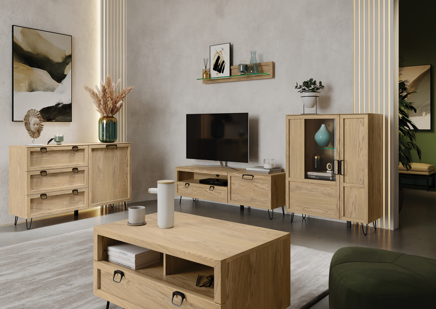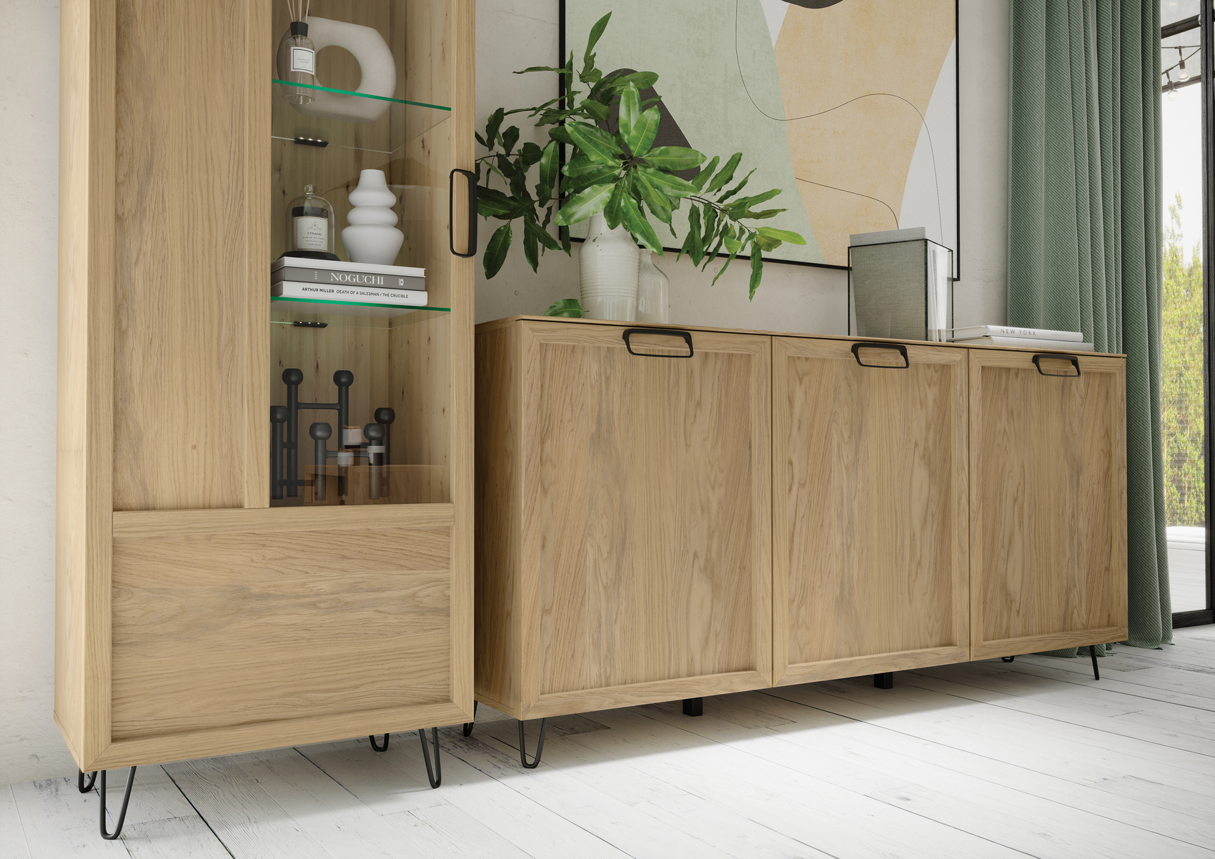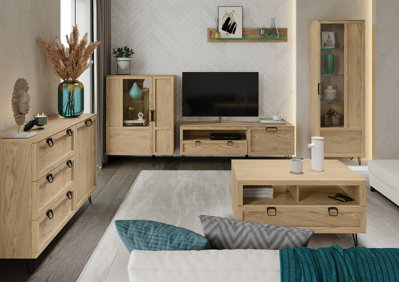 Tato kolekce nábytku vyniká použitím ceněného dubového dřeva které je v dekoru dub artisan lehce bělený a použitím masivních rámu pro skla což zvýrazňuje modernost této kolekce. Dále také použití kovových nohou které jsou designově sladěny s úchytkami v černé barvě je teď velice módní.