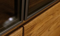 - jantar - kartáčovaný povrch dřeva, rámy skel zabarveny do tmava sklo v rámech kouřové.