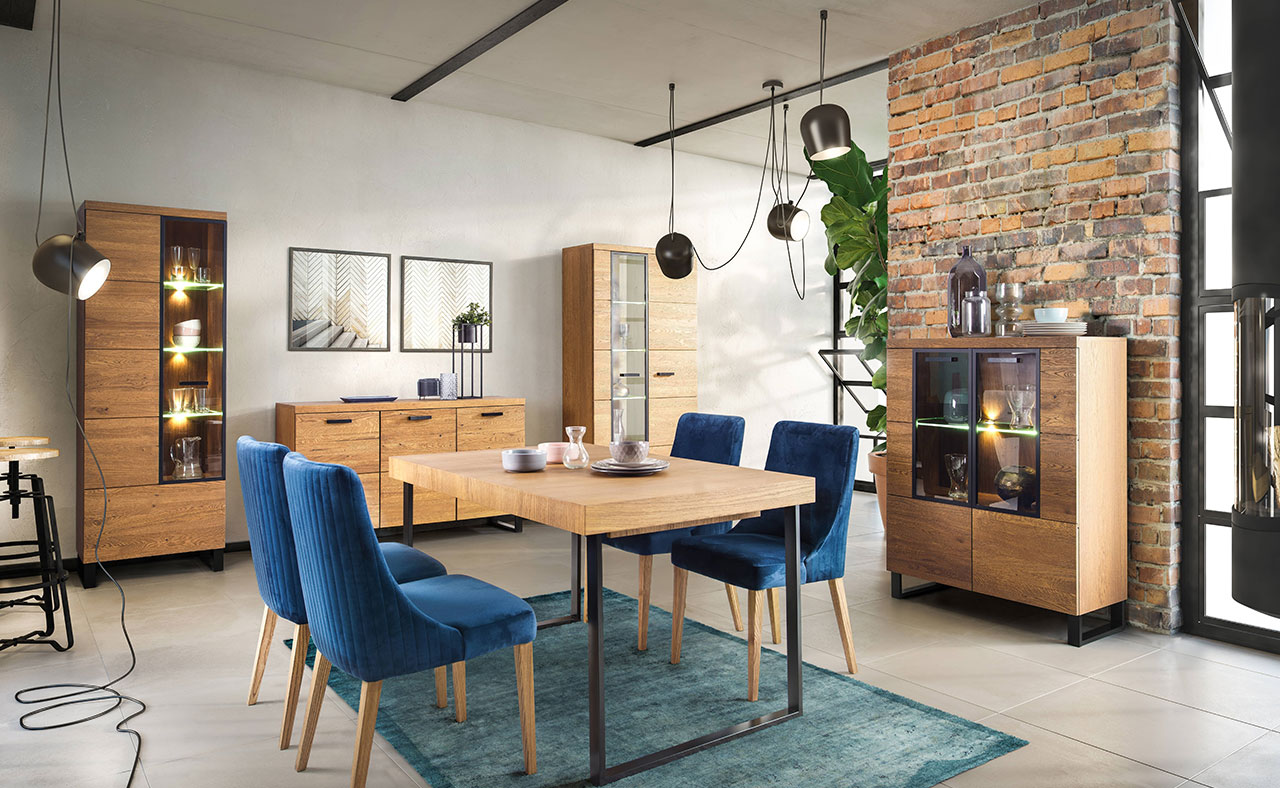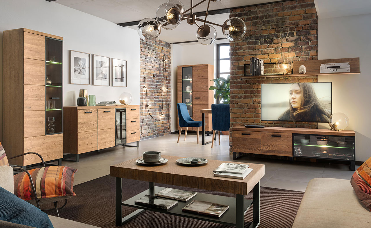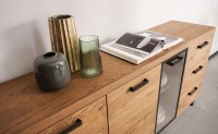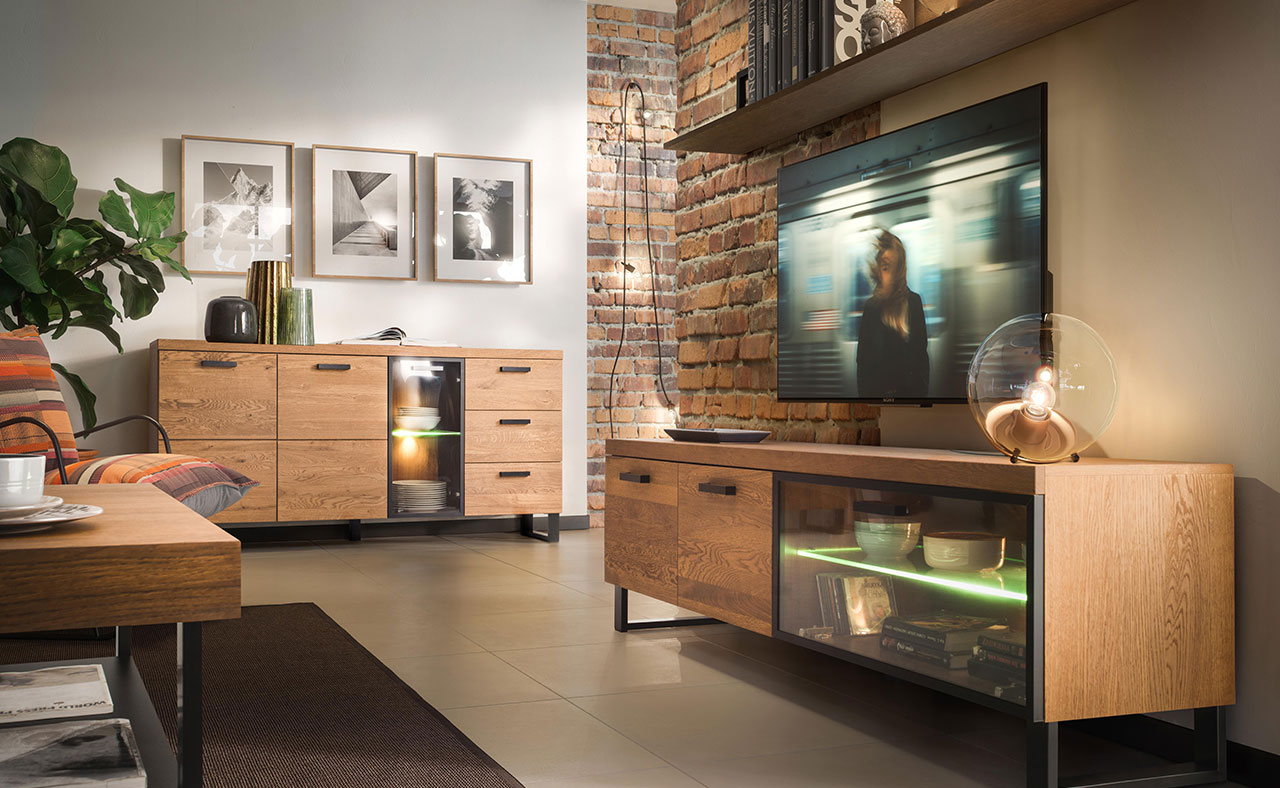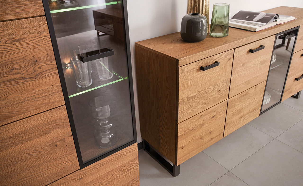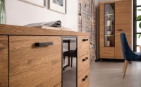 Kombinace skla ve tmavých rámech, kovových úchytu dodává této kolekci jedinečný vzhled. Povrch dřeva je upraven kartačovaním - není hladký, při dotyku je krásně cítit i vidět struktura dubového dřeva. Vysoké kovové tmavé nohy jsou teď velice módní a mají také svůj praktický význam protože umožňují udržovat větší čistotu v místnosti. Kolekce PRATTO nabízí celou řadu samostatně prodejných prvků, díky kterým můžete zařizovat nejen obývací pokoj, ale také jídelnu. Seznamte se s celou nabídkou a vytvořte si vlastní sestavu nábytku PRATTO.