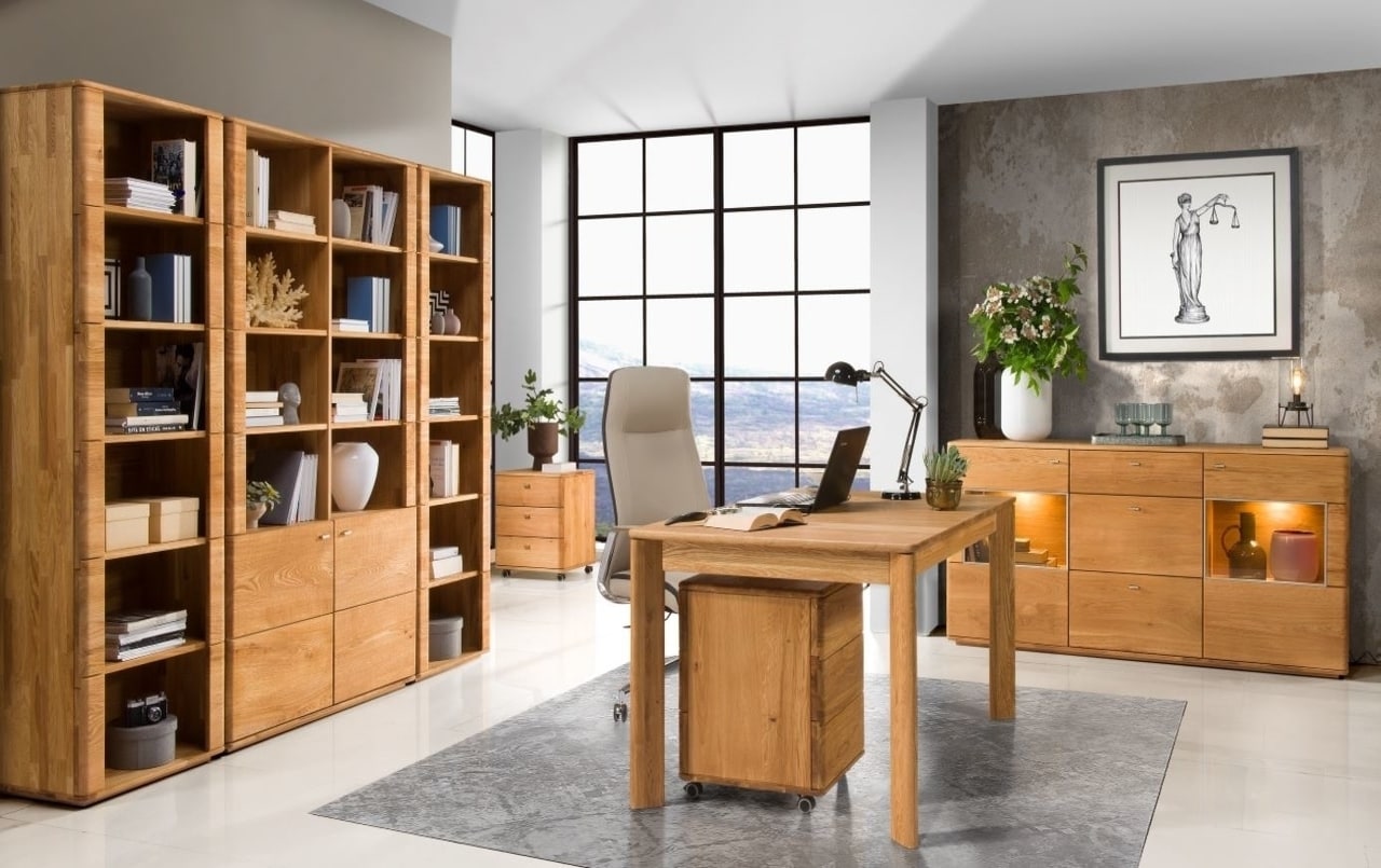 Elegantní dubová obývací sestava z masivu a přírodní dýhy. Moderní design zdůrazněný barvami sukatého dubu přinese do vašeho domova pozitivní energii. Kolekce PORTO nabízí celou řadu samostatně prodejných prvků, díky kterým můžete zařizovat nejen pracovnu. Seznamte se s celou nabídkou a vytvořte si vlastní sestavu nábytku DENVER.