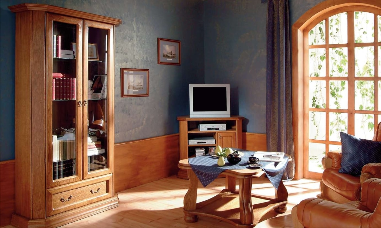 Rustikální nábytek z masivu dub v kombinaci s dřevěnou dýhou. Samozřejmostí je vysoká úroveň řemeslného zpracování a kvalitní materiál - masiv dub. Použité čiré sklo je z boční fazetou.